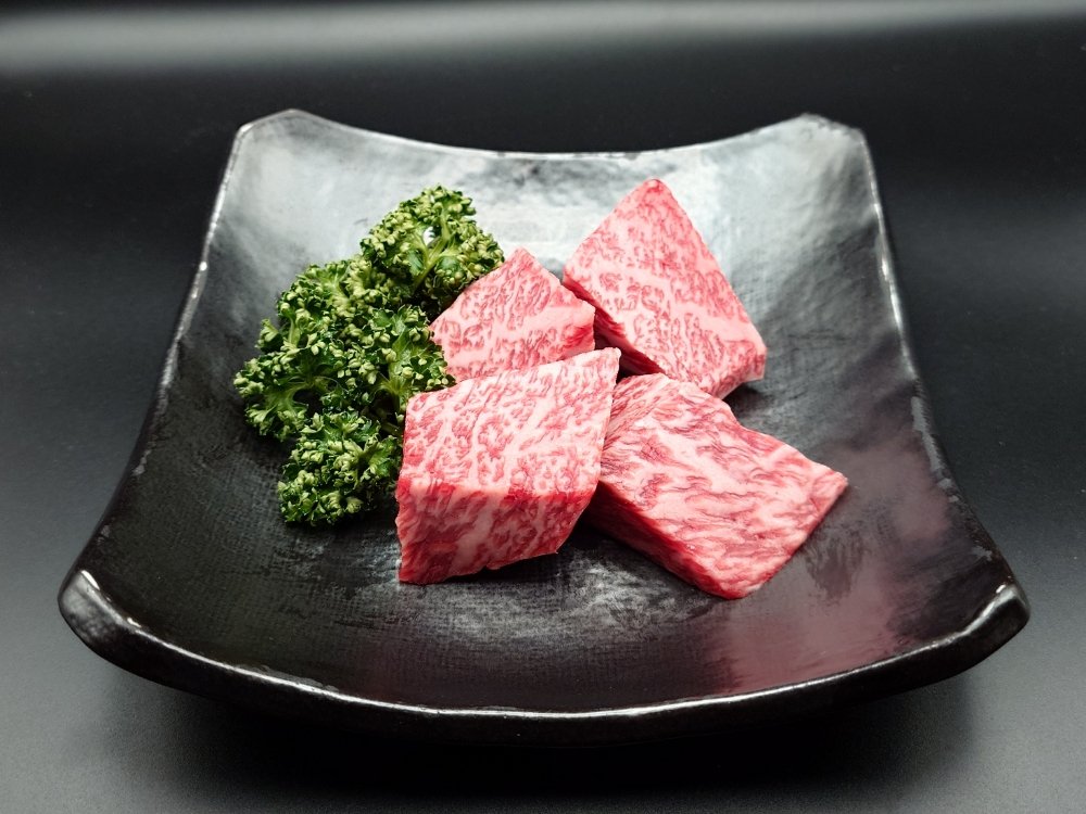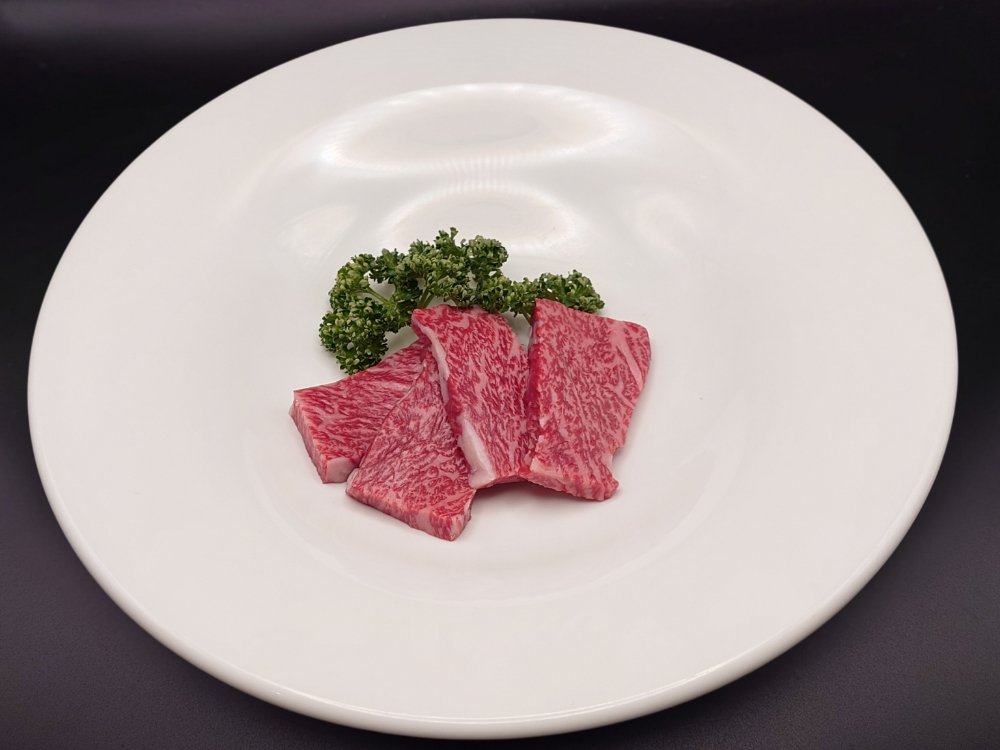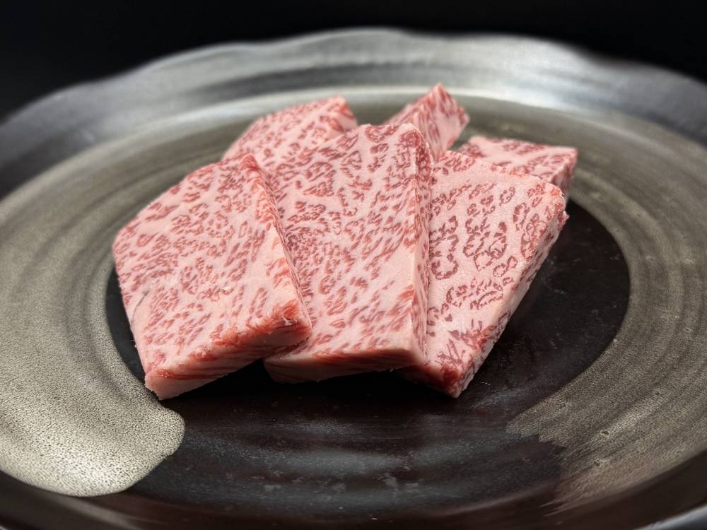 通常の焼肉店などで提供されるような均一の大きさ・形・厚みにカットせず、あえて不均等にカットすることで、お客様がまめにお肉をひっくり返しても、火入れが不均一になって、肉の旨味を引き出しやすくした「歪みの賜物」。