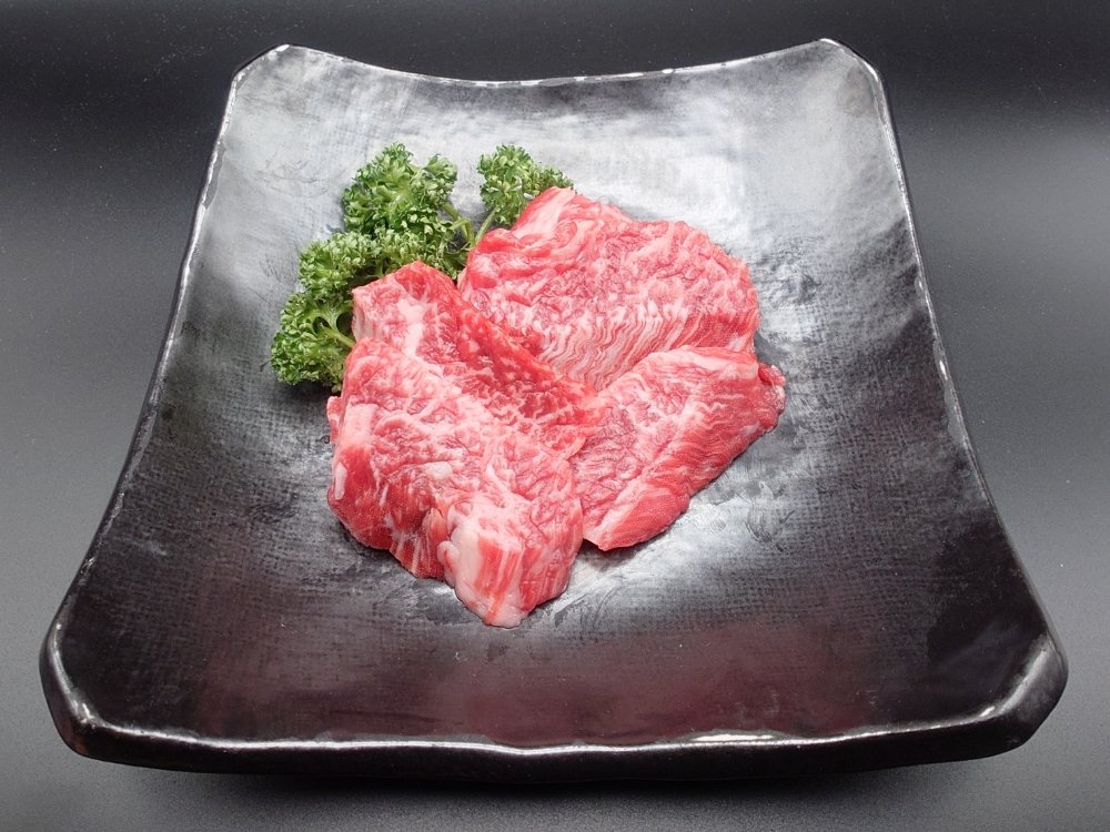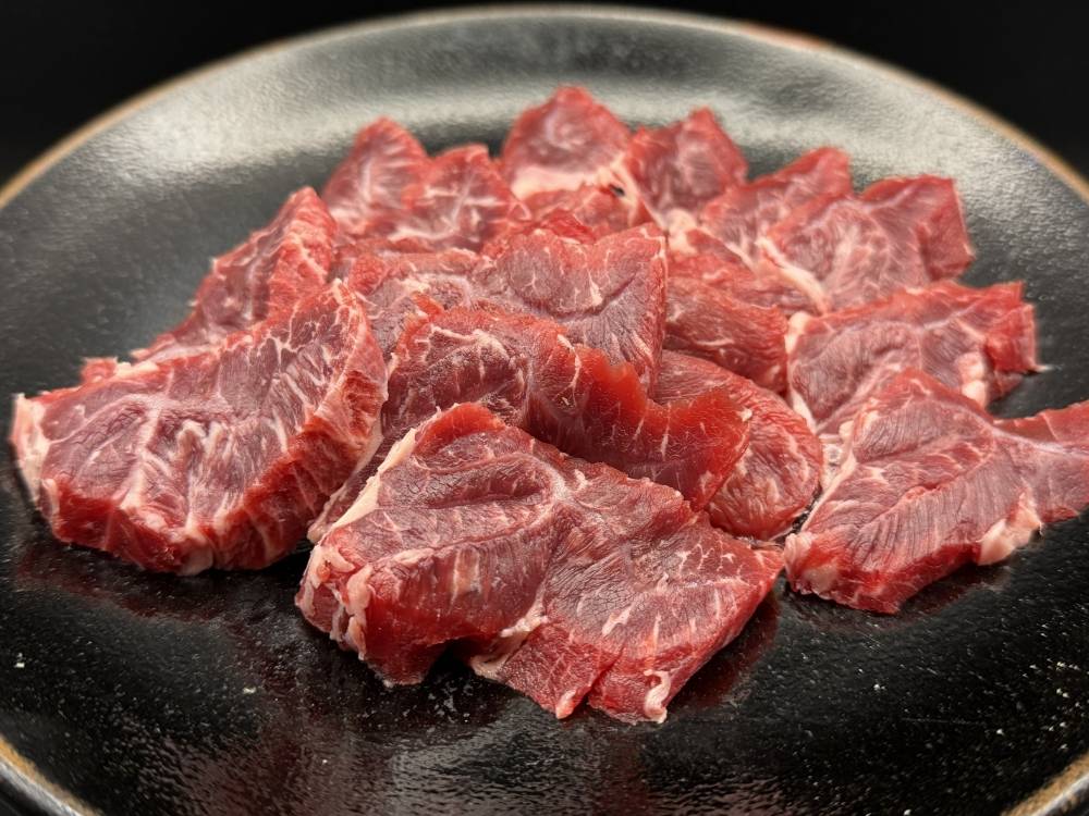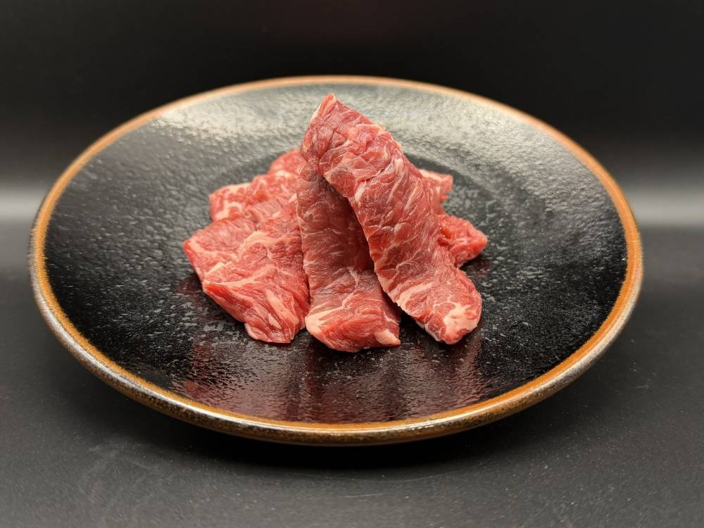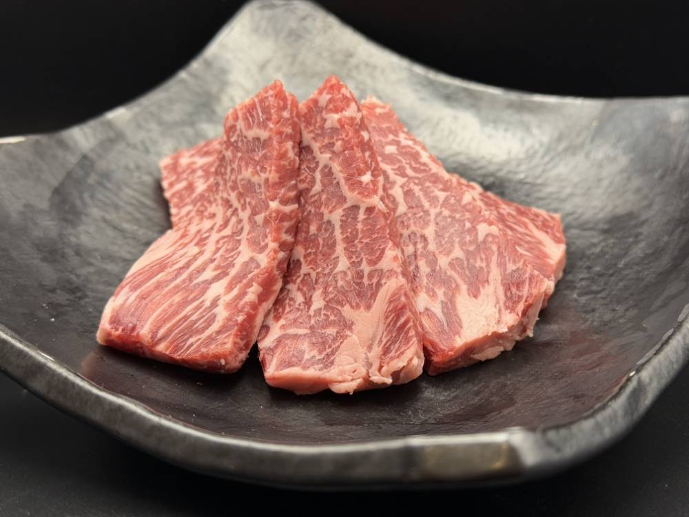 ハラミは、横隔膜の背中側で、見た目は赤身肉に似ていますが、ホルモンに分類され、牛一頭から約2~3kgしか取れない希少部位になります。濃厚な旨味と甘い脂身のバランスが絶妙で、適度な脂肪量で柔らかく、ジューシーです。内臓系の部位特有のクセがなく、カロリーも控えめです。